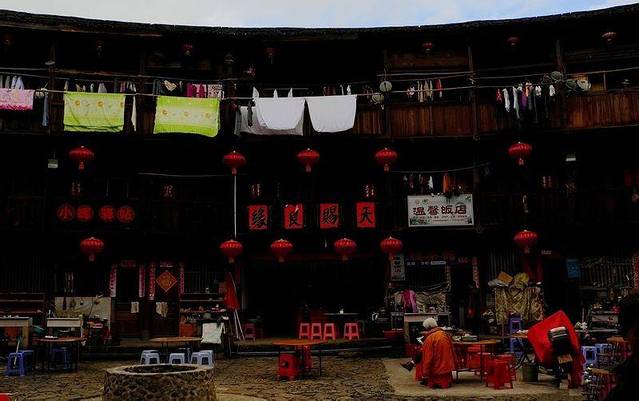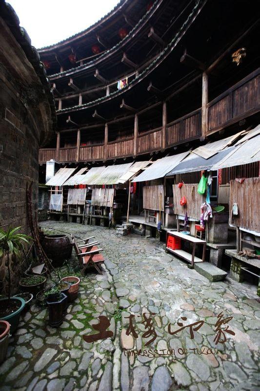 一早上的时间都在怀远楼里消磨,也许是第一次走近的缘故,视觉很特别。再因为游客较少的原因,我也慢慢地逛,慢慢地跟住在土楼里的人家有一句每一句的聊着。午后,租了一辆面包车去田螺坑,漫游土楼。天气有些放晴,到田螺坑的时候在土楼里终于看到蓝的天和厚厚的白云。我想夏天傍晚的火烧云、有明月的晚上、明净的星空,这一方小小的世界一定格外的美好。