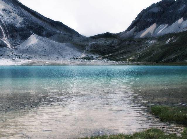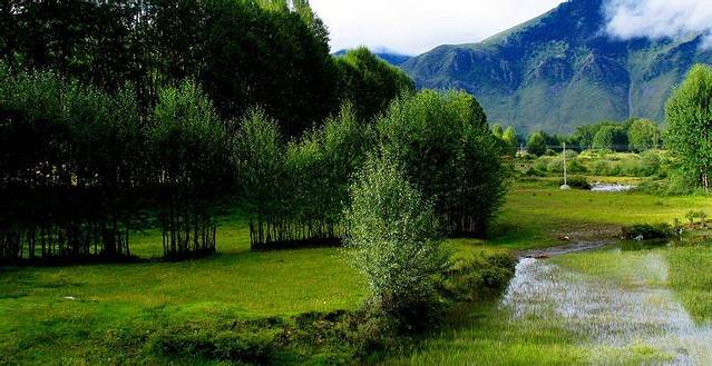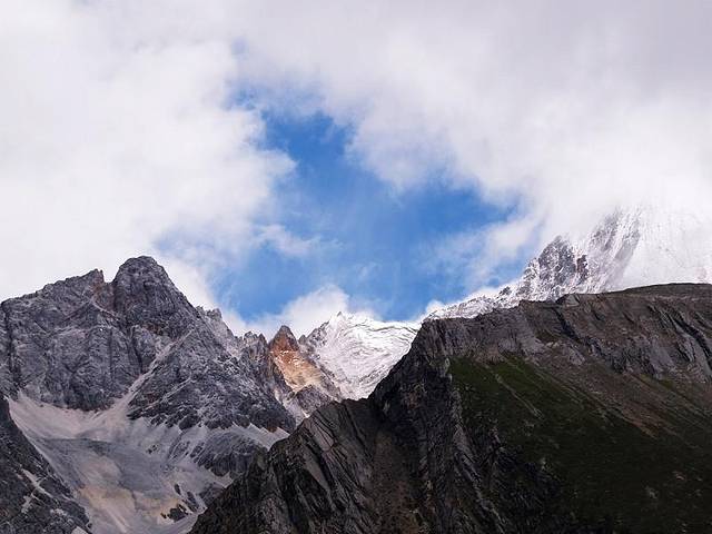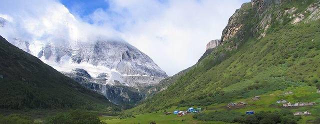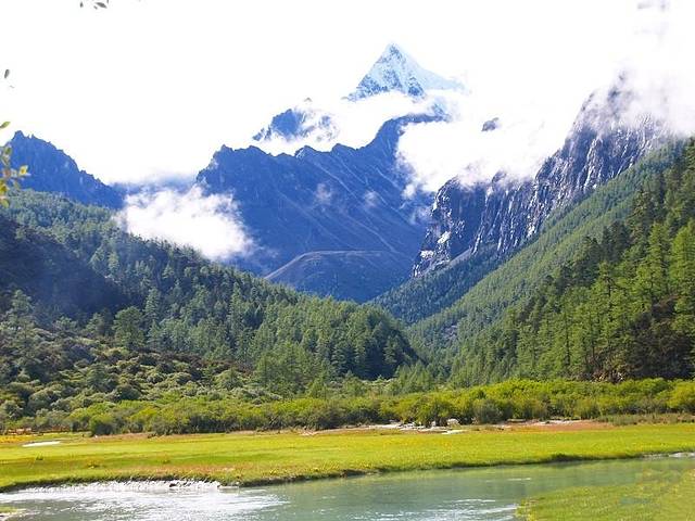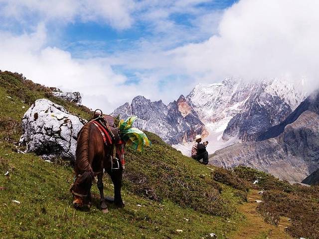 早上6点起床,吃了泡面就要骑马上山。令人欢欣的是这天天气出奇的好。往山上走去,空气是那样的纯净。云雾像诡秘的魔术师,不时变幻出各种奇特的景观,让人目不暇接。林子里有各种漂亮的鸟、可爱的松鼠。在这座神山上,千年的玛尼堆更是蕴涵无尽的魅力。洛绒牛场被“日松贡布”三座神山环绕,贡嘎河从草场穿梭,林间溪流潺潺,与牧场木屋交相辉映,构成了一幅原始而又迷人的景色,令人们进入返朴归真的境界。洛绒牛场海拔4150米,是附近村民放牧的高山牧场,成群的牛羊在这里享受着充足的阳光、青青的草地和纯净的湖水背靠三座神山仙乃日、央迈勇、夏诺多吉,是观看三座雪山的最佳地点。长途跋涉的旅人可选择在此宿营,也可自己搭帐篷住宿。