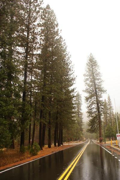 从拉斯维加斯去优胜美地这一路走走停停开了十四五个小时,一直在沙漠中的公路上穿行,这一路才真正的有了西部的感觉,但是也很容易使人疲劳,开车的朋友一定要注意休息,的公路设施比较完备,路边都有很宽的临时停车带,可以随时停车休息,而且风景也是很棒的。在开到优胜美地附近的时候开始下雨,由于又是山路,开的比较慢,在晚上12点的时候才到达公园附近的一个小镇住下。第二天起来,外面还是蒙蒙细雨,吃过早饭,开了半小时就到了优胜美地,因为这里也曾经是印第安人繁衍生息之地,而“约塞米蒂”一词在印第安语中意即灰熊,是当地印第安土著的图腾,所以这里的很多纪念品和LOGO都有一只熊。