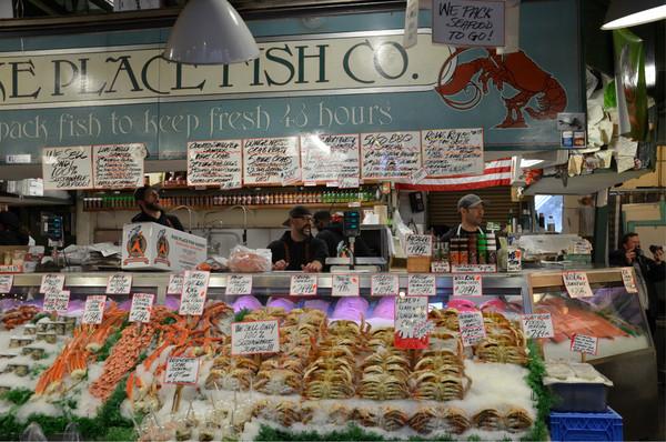 一天时间不长,我们去了比较有名的派克市场,只是听说那里有著名的“飞鱼秀”,也不知道到底是个什么表演,就慕名而来了,到了市场门口,就看见一群人围在一起,又拍照,就叫好,凑过去发现,是一个卖鱼的摊位,正在把各种新鲜的大鱼,在空中抛来抛去,同时还喊着整齐的口号,几个人分工很明确,有负责叫卖的,有负责称重的,有负责打包的,有负责收费的,这就是传说的“飞鱼秀”。