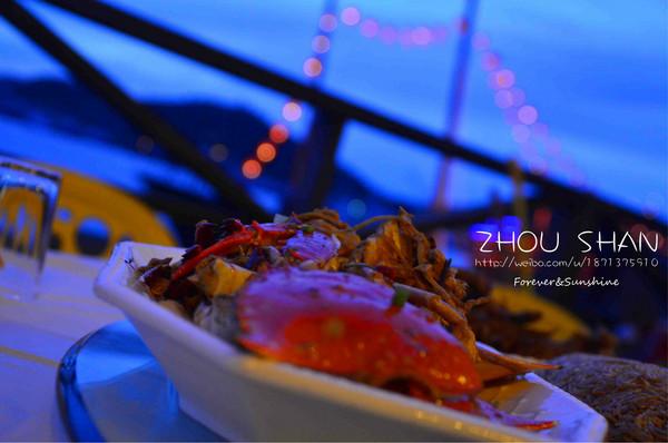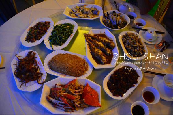 游好了回宾馆,我们肚子开始饿了~~我们住的宾馆的对面是沈家门渔港大排档,走到对面是46号店铺,老板娘很热情,知道我们是听障人,本来是420元,便宜给我们,只花300元,里有白蟹、海瓜子、海蜇、大黄鱼、炒粉丝、鱿鱼炒青椒、空心菜、清蒸带鱼、烤子鱼、花蛤.