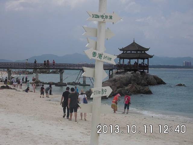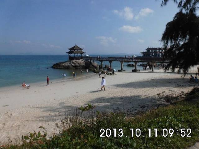 在网上定好了一日游,早上7点就跟车出发,一路接人,然后坐游轮上蜈支洲岛,岛上风景很美,沙很白,要穿鞋,因为有碎珊瑚扎脚,紫外线很强,一定要准备防晒品,高消费,吃饭喝水玩什么都贵,坐个环岛电瓶车最多也就半小时吧,80元,拖伞潜水项目就没参加了,太贵了,因为我们在网上订了其他地方的潜水,很划算,估计在岛上玩项目导游有提成,在车上一个劲的说,到了景点买完票就不见人了,沙滩上的躺椅也是要租的,50-100元一小时。下午去的南田温泉,设施很好,浴巾什么都有,池子很多,温度适宜,特别是亲亲小鱼,痒痒的,下次有机会还得去,晚上还去看了红艺人表演,那些泰国红艺人很漂亮哦,第一天的行程很赶。