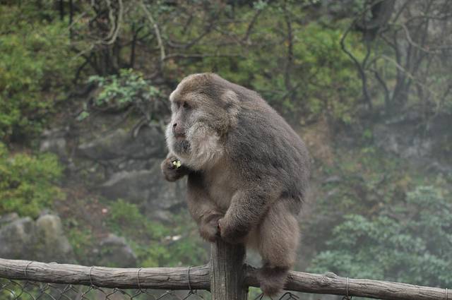 我们两个女的,被发火的猴子吓到了,赶快上山了。不时路过猴群出没地,一大帮的猴子在路上,又喜欢,又好怕,哈哈。我体力差,走走停停,就被远远抛在后面了,眼看慢慢天黑了,而我已经好累了,此时峨眉山里都雾蒙蒙,好仙境,有只小松鼠跑出来,在我脚下经过,距离我就那么几厘米了,好惊喜。但是不容慢慢留念,因为天快黑了,没路灯会很怕,就继续往上爬。
