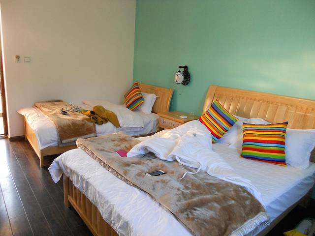 老板是本地人,院子还不错,没事的时候可以再院子了晒晒太阳。但是因为是木头的房子,隔音效果差,住了两晚,我们两都没有睡好。我们定的是特价房86元,老板给了我们个三人间,房子很大,但是灯光有点昏暗,而且厕所有点破,个人不建议居住。