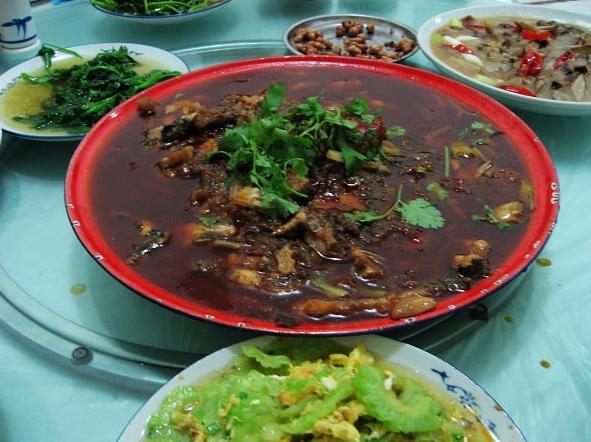 我们晚上在川主寺的一个什么鲇鱼庄吃了顿告别宴,明天就要和装装和司机分开了,感谢他们一路来对我们的照顾和配合。 这个店的鲇鱼很不错,味道很重!鱼片也嫩!可惜要价太黑,居然卖80一斤!!!靠!!!比上海还贵很多!!!