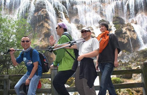 传说中的珍珠滩瀑布 当年西游记也在这里取过镜 师徒四人。。。话说拍这张照片的时候我们其余人员还把片场给围了起来,引得身后许多游客围观,你们出名拉!哈哈!登山杖三角架全都当道具了!亲哥很入戏啊!