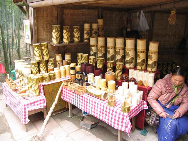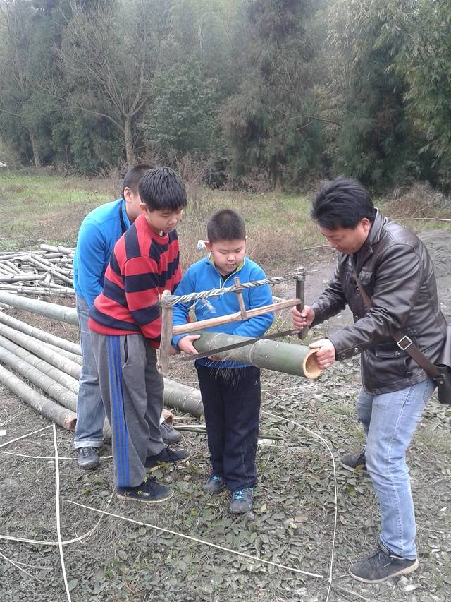 七贤庄的老板帮孩子们锯了两个竹筒带回