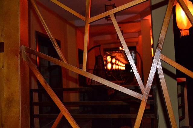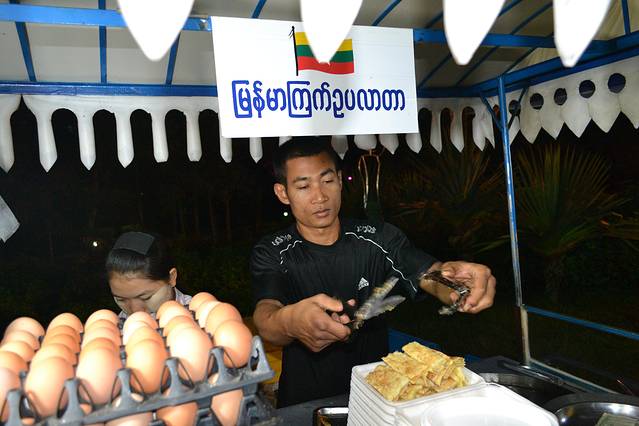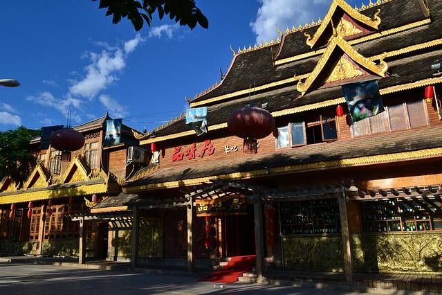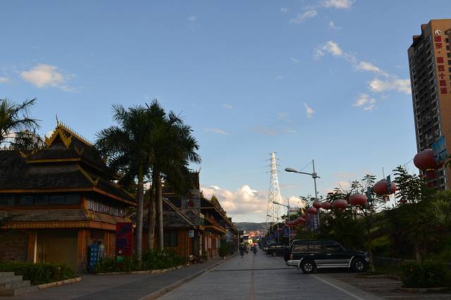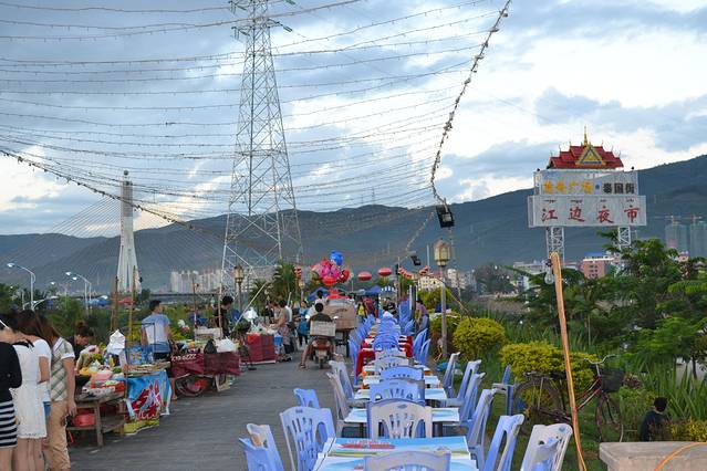 步行半小时左右就到了西双版纳著名的滨江夜市,这里有很多小吃和工艺品。虽然17点左右就有人开始摆摊,但夜市要18点50才供电,所以吃小吃的童鞋要晚一点来,推荐香蕉巴拉达和鲜榨果汁,前者一定要趁热吃,凉了之后的味道是非常悲剧的。夜市对面有一群很有民族特色的建筑,是一条酒吧街,本身对酒吧不感兴趣,所以只拍了几张照片。