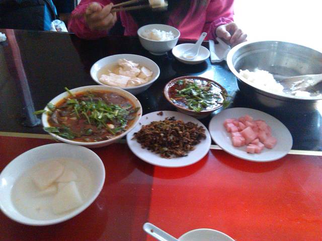 依然是颠簸的6小时,中途会停下来吃午饭,12元一个素菜,25元一个肉菜,米饭+餐具2元,听起来似乎不贵,但这些菜实际上就是学校食堂里那种大锅菜,炒出来一大锅,然后论份卖,米饭估计是因为海拔的原因,有些夹生。