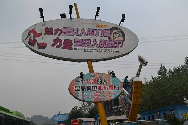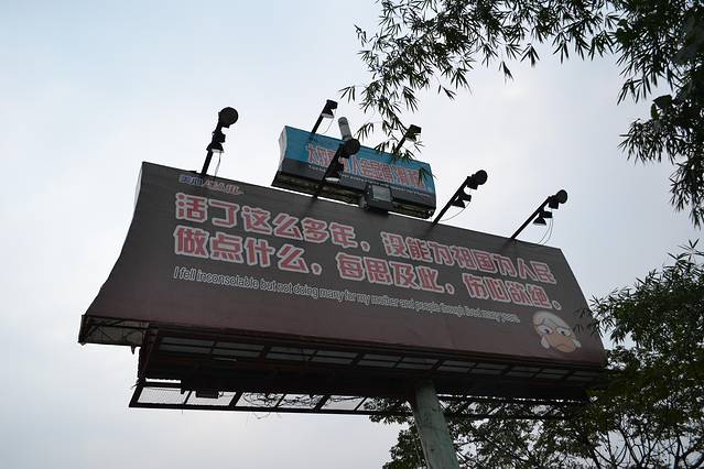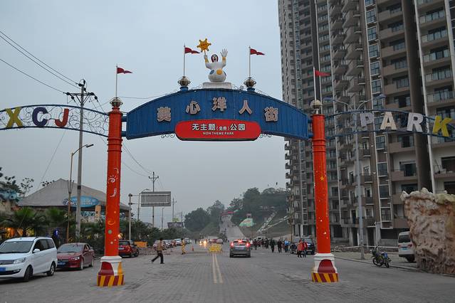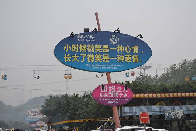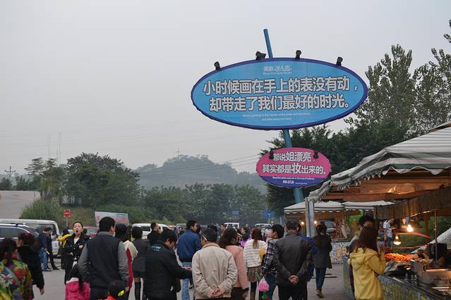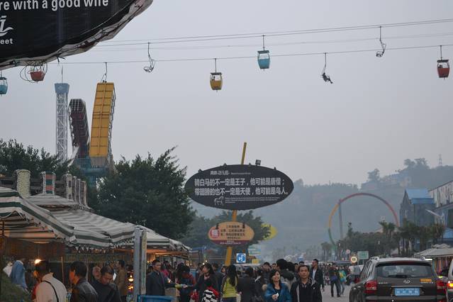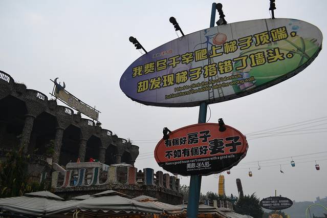在朝天门码头乘坐轮渡到洋人街码头下,这里是一个很有特点的游乐场,有很多个性十足的标语,另外亚克西的烤羊肉串也很好吃,园区很多卖的,都是3元一串。