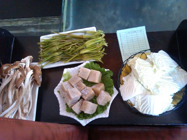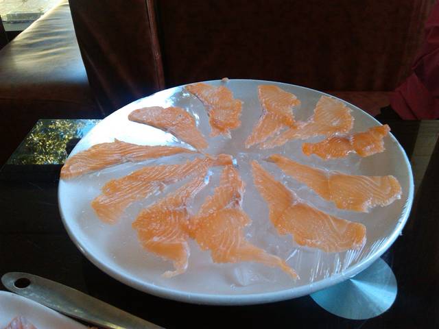 这顿午饭为丽江的餐饮挽回了一丝颜面,三文鱼的口感真的非常细腻。虹鳟(三文鱼)38一斤,还有一种叫金鳟,88元一斤。三文鱼是一鱼三吃,生鱼片蘸酱、炸鱼皮做菜、鱼头入火锅涮汤,所以除了点鱼,还要点火锅锅底和涮菜,吃生鱼片还要芥末酱油和醋,都是钱哪。两个人一共花了近200元,这也是我们此行吃的最贵的一顿饭。