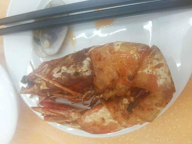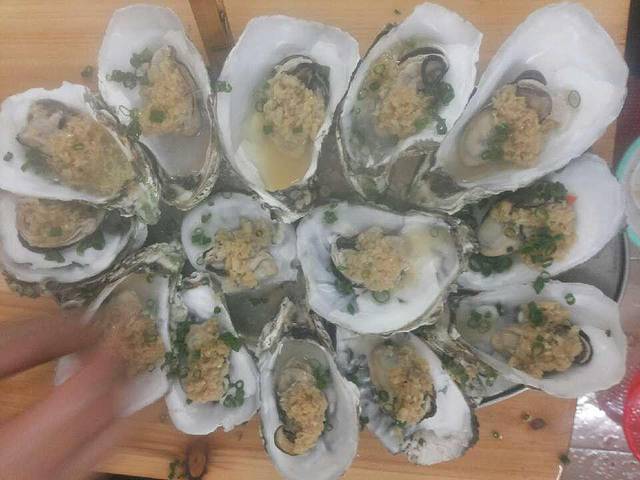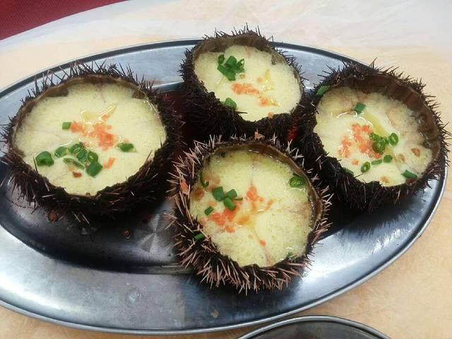 除了海鲜,我们又点了个素菜,估计也就几分钟,菜就端上来了,翠绿色的还点缀了少些红色辣椒,看着就很有食欲。我和老公立刻就动了筷子,吃在嘴里感觉很清脆,稍有丝丝辣味儿。海鲜陆续被端上来,最难忘的就是这个大对虾了,真的是又辣又香,北方也能吃到,但是味道却远不及这里的,估计是因为大对虾活的吧。好大个儿哦!这个生蚝做到虽然看着样子平平,味道可不赖,粒粒都肥美可口。海胆蒸蛋耶,我在北方就没吃过这菜,特意记住了它的名字。毛茸茸的海胆像个刺猬,里面却是柔软至极的蒸蛋,蒸蛋上浮了一层油,再加上小葱花点缀的黄蛋蛋,嘎嘎,色香味俱全,开动开动!