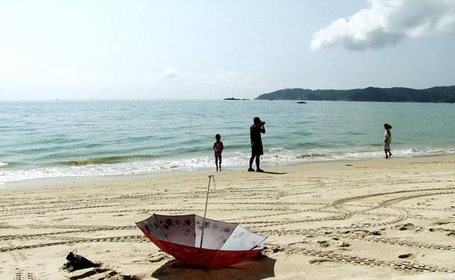 这一夜睡的,梦太多,有些累。不过一想到马上就能去领略三亚风光了,好期待噢,立刻精力充沛。和老公匆匆的吃过早餐后,我们打的来到中国第一湾-亚龙湾风景区。嘿嘿,原来椰子树是长这个样子啊,只在电视上见过的哦。 三亚和北方比起来真的是好温暖啊,应该有20几度的样子,由于不会游泳,所以只能卷起裤管,在浅水处稍稍活动几下啦。看见老公兴奋成那个样子,像个孩子一样跑来跑去,还狂吼!晕倒!!别说了老公了,其实我也一样,我们俩竟然在沙滩上玩起沙来。老公面朝大海深呼吸。