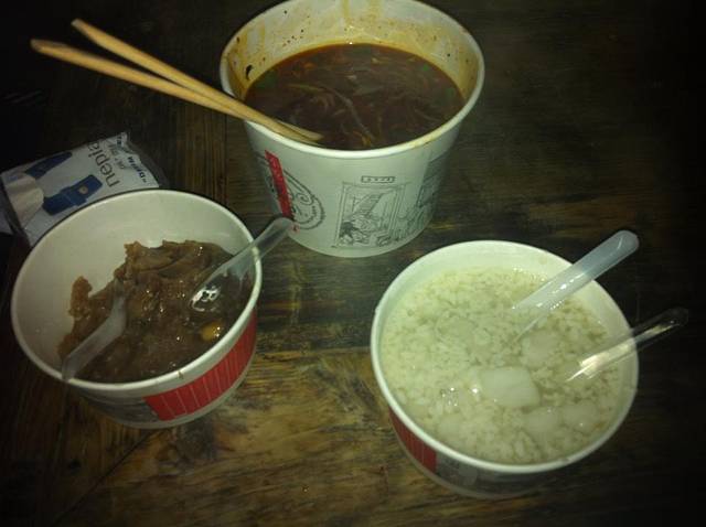 在酒店对面的一大口面馆点了怪味抄手、香酥面(上面撒点牛肉丝一类的东西)、粥,另外买了油条。