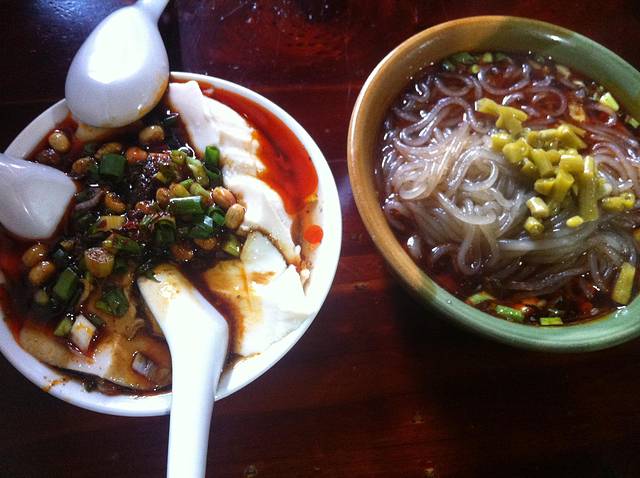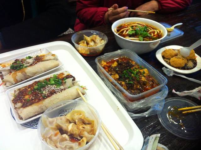 在夫妻肺片总店左边春熙坊唐宋美食街的地方吃了第一餐,里面相当深,晚间还有表演看。里面聚集了很多店,吃了钟水饺、陈麻婆豆腐、一根面、三大炮、蔬菜春卷这些