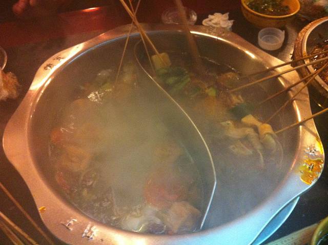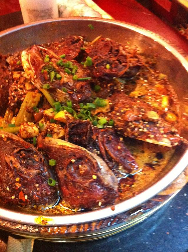 回宾馆放下东西,出来吃串串香(火锅、干锅、冒菜都吃过了),就是把本来烫火锅的盘子菜串在竹签上,一起放进锅底,熟了把串串拿出来用筷子撸到自己碗里。吃过蜀九香之后再吃这个,就是渣渣呀……奥,还点了个干锅兔头,味道不错。