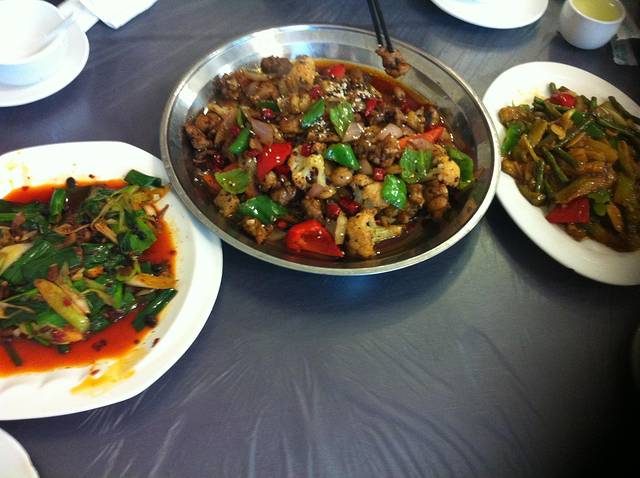 早上睡到自然醒,结果逛完熊猫基地都两点多了。在公交换乘的地方对面找了个小饭馆,点了干锅牛蛙、回锅肉、蔬菜,感觉味道和苏州的川菜馆很不同。