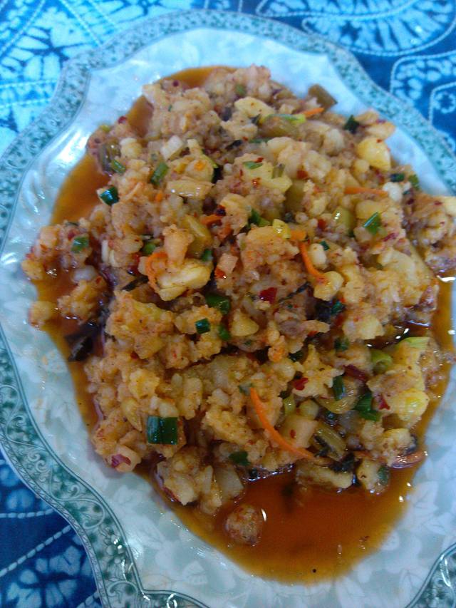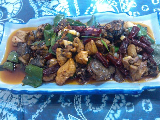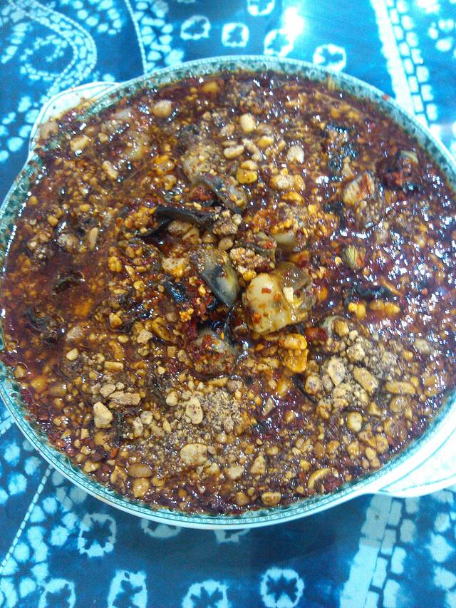 晚饭选择了经济半小食,同样在客栈附近很好找,人气很旺,院子里都坐满了,味道接近川菜,我们点了乡巴佬茄子18,伤心牛肉38,酱爆螺狮28,米饭4,碗筷2,白酒8,一共花了98元