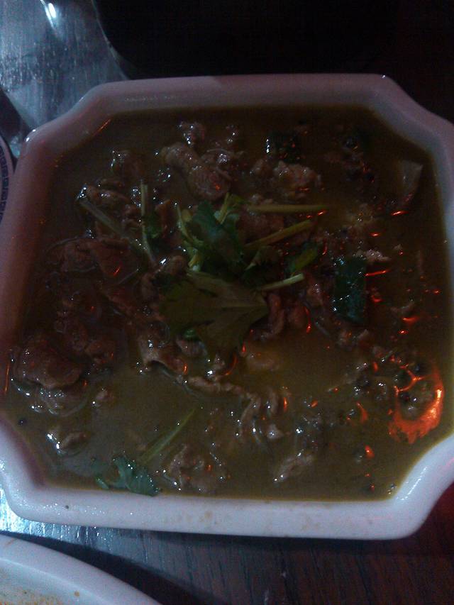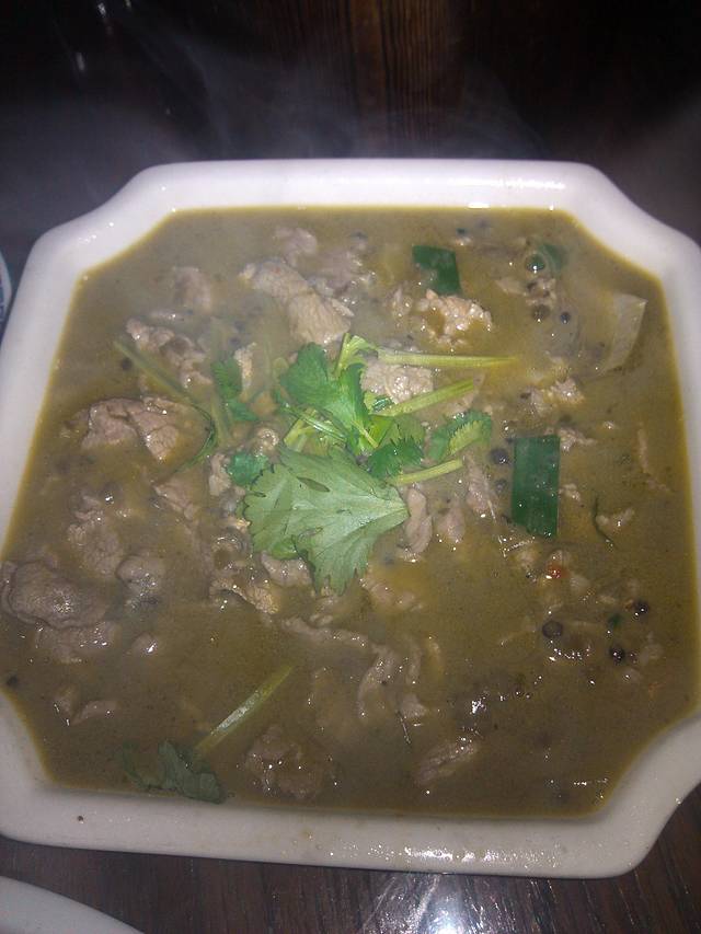 今天到这里尝尝黑山羊火锅,六点半到的已经没有位子了,等了半小时吧,终于就座,黑山羊火锅味道也不错,羊肉炖得很烂,大冷天的吃着很爽,两个人一个小锅足够了,别忘了蔬菜和主食都是免费的呦。小份黑山羊锅子是100元,其他都免费。