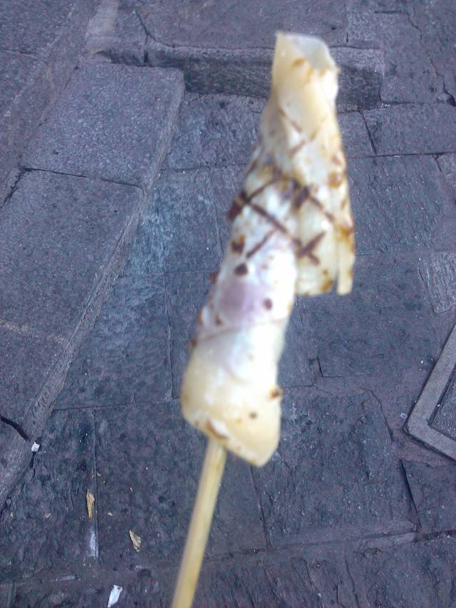 哈,小吃街沿路全都是各种小吃,有一种用培根裹着青笋的看起来很不错,要了一份,有8个,15元每份