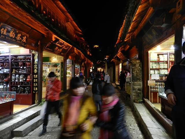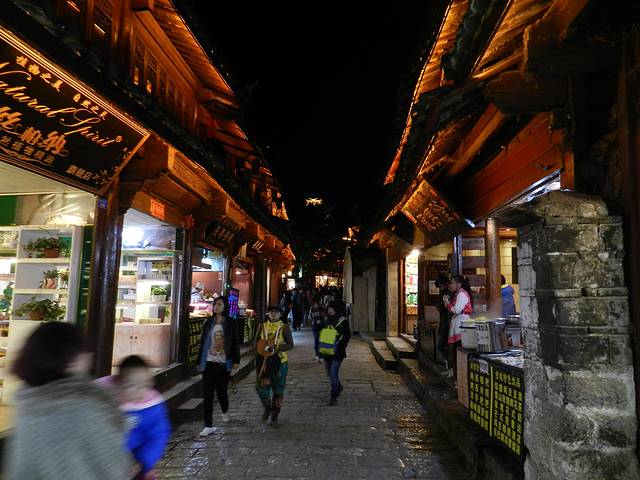丽江最有名的之一就是酒吧多,其实整个古城里各处都分布着大大小小的酒吧,但是有一条街上集中全部都是酒吧。就是从四方街往大水车走的这条路上,叫做酒吧一条街。但是听客栈老板说,这里的酒托也很多,其实很乱的,建议我们还是不要去,所以我们也就沿着路一边走一边看看,没进去消费。