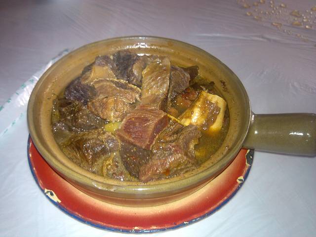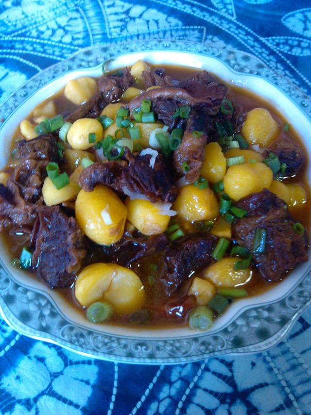 从古城东门往里走,一百多米处就是点评上名气颇高的益恒饭店,没有菜单,看着小黑板上写的菜来点,香草排骨5元钱一根,要了4根20元,老奶洋芋12,板栗牛肉35,米饭4,碗筷2,梅子酒4,一共77元。洋芋其实就是北方所说的土豆,不过这里是碾碎了炒的,排骨肉比较难啃,牙口不好的就别点了。