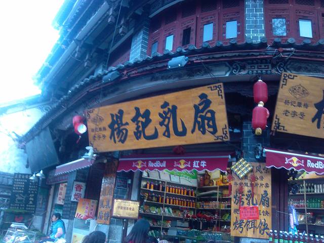 古城里到处都是烤乳扇的,但就这家最有名,在复兴路的一个十字路口,很多人围着买,5元一个,是一片乳扇刷了点玫瑰酱,然后绕在一个棍上,放到篦子上烤一下,吃起来奶味比较重,我还蛮喜欢的。
