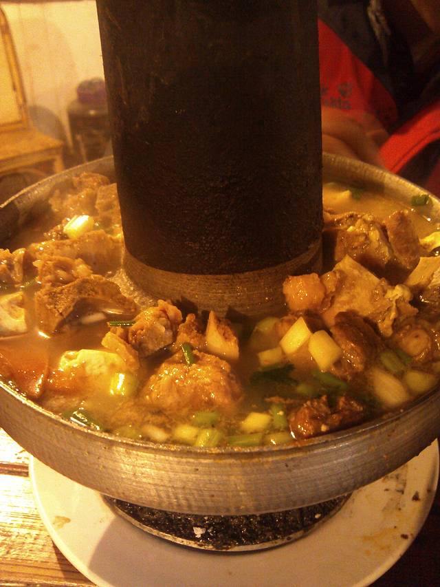 这家生意是我到丽江以来见到最为火爆的,其实环境非常差,就是个苍蝇馆子,自家小院里放了几张桌子,地上脏兮兮的,桌子擦的也不干净的,也没什么服务,什么筷子主食蔬菜都是自己去拿,但是什么时候去都要等位。也许是点火锅的话蔬菜主食都免费比较吸引人吧。我们点了个腊排骨火锅小份50,酸梅汤2杯10元,其他的都是免费的,一共花了60元,吃得很饱。