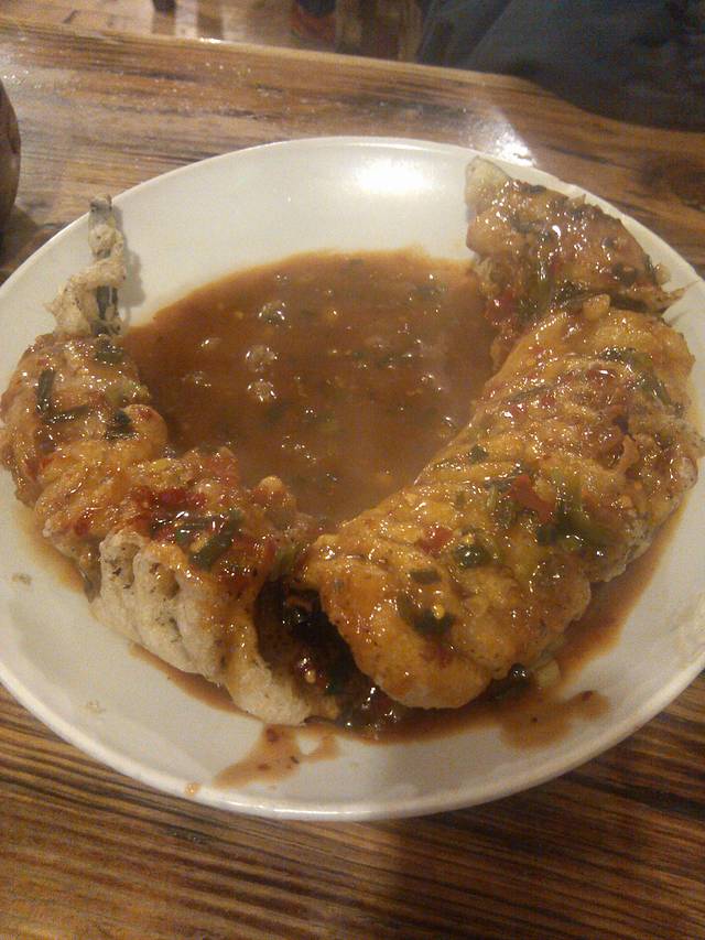 看着这个名字就很江湖,里面又有特色菜,怎么能不进去一尝。过江茄龙30,水煮肉35,米饭6,碗筷2,一共73元。过江茄龙是招牌菜,每桌必点,味道也没有让人失望,酸酸甜甜的很好吃,就是把整条茄子切花刀后用油炸,外皮酥脆,里面软糯,整个造型像一条龙。