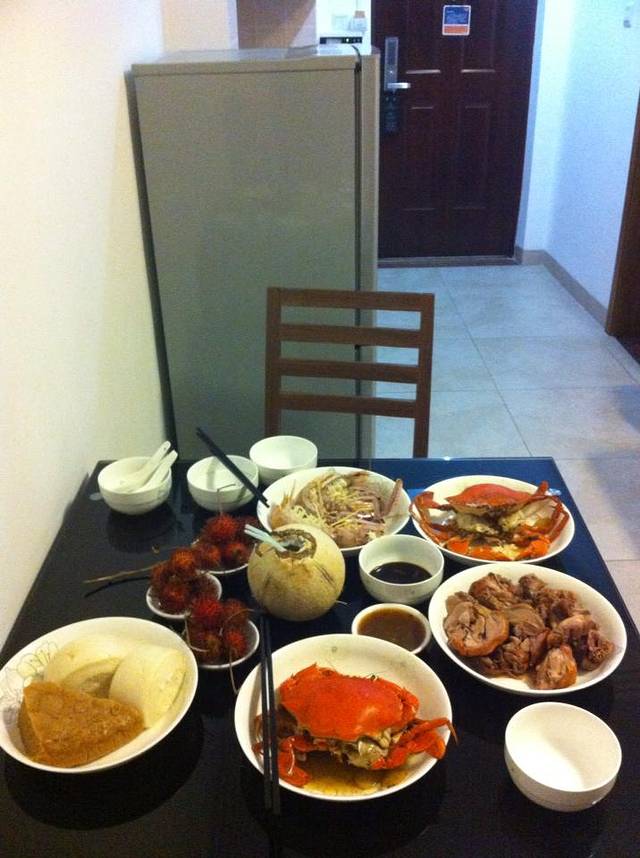 到酒店已经凌晨,放好行李收拾妥当下楼觅食,太饿了就近找了家海鲜大排档(周围有好几家,目测没有太大区别)。有各种烧烤、海鲜、主食,打包回酒店房间里摆了一桌,代表三亚人民欢迎我们的到来。值得一提的是店里最后一只大青蟹,一顿砍价后成交,回去剥开后发现又肥又鲜,虽然忘了问大排档拿酱油回来,依然瞬间消灭。