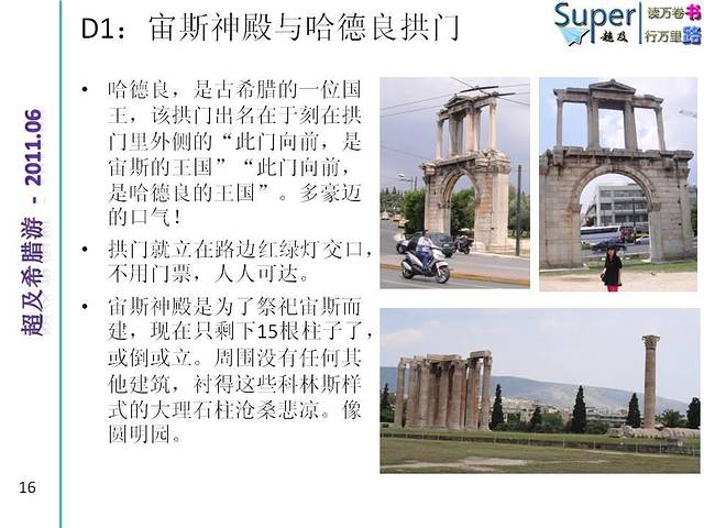 哈德良,是古希腊的一位国王,该拱门出名在于刻在拱门里外侧的“此门向前,是宙斯的王国”“此门向前,是哈德良的王国”。多豪迈的口气!