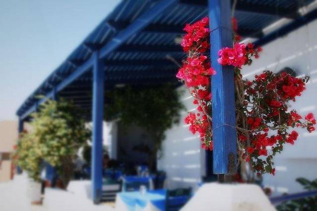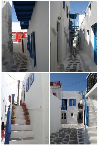 最为体现米克诺斯风情的,莫过于蓝白相间的小巷和街道建筑。多是一层或者两层的建筑。地面石砖的缝隙会用白色的油漆描上厚重的白色纹路,建筑物的门窗屋瓦多是漆成纯正的蓝色,是天之蓝、海之蓝(不是广告,如有雷同,可收取广告宣传费用)
