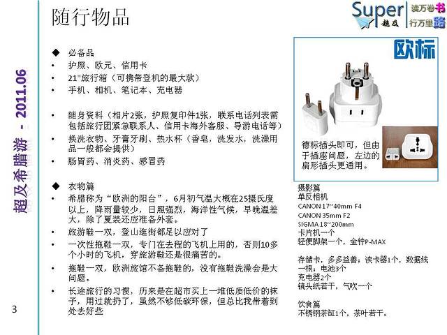 单反相机。CANON 17~40mm F4。CANON 35mm F2。SIGMA 18~200mm。卡片机一个。轻便脚架一个,金钟P-MAX。存储卡,多多益善;读卡器1个,数据线一根;电池3个。充电器2个。镜头纸若干,气吹一个。