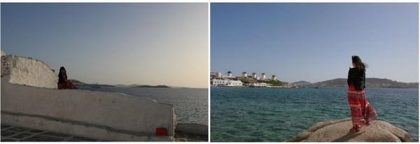 伊亚的主街道的一侧紧邻着悬崖,侧身远望,海蓝一片,不同的地点会点缀上不同的建筑作为前景,爱琴海本身就是美女,再搭配各式霓裳,自然是清新妩媚,姿态万千。