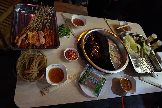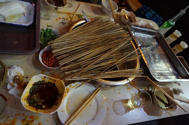 王府井百货后面的玉林串串香是我们品尝的第一顿成都美食,看看最后的战果就知道我们的战斗力了。