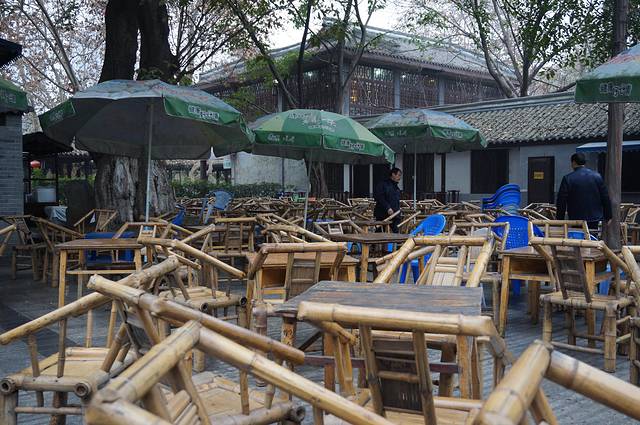早上九点茶社还没客人,伙计才开始整理凳子。我们也还要去宽窄巷子,茶是一定要喝的,但今天就只当路过了。