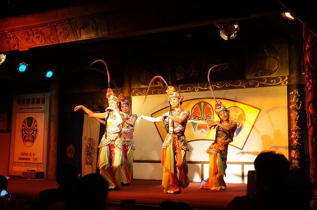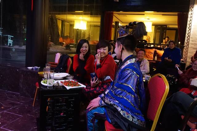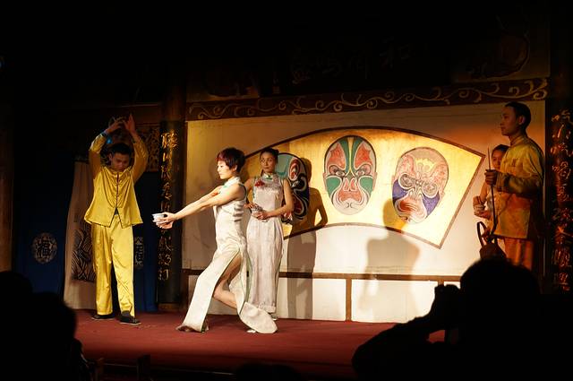 来成都后查了一下,文化公园的蜀风雅韵和老顺兴茶馆的民俗表演是主要的两个表演,既然来了这里就看这里的表演了。4点多本来还有4排的68元票,去下面KFC坐了会再上来订票居然只剩8-9排的票了,锦里看戏是第一排这次坐这么远不甘心,趁还没营业和经理沟通下来在第二排加了一个桌子,票价98,感觉比4排的68还值。