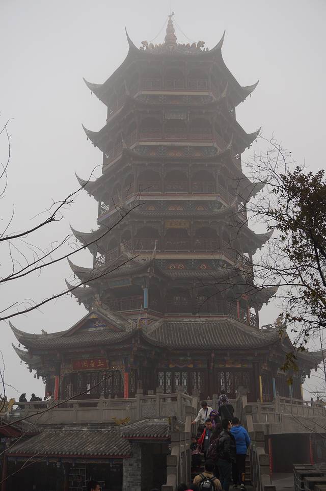雾中的玉垒阁雄踞山顶