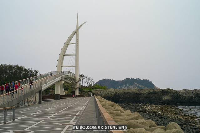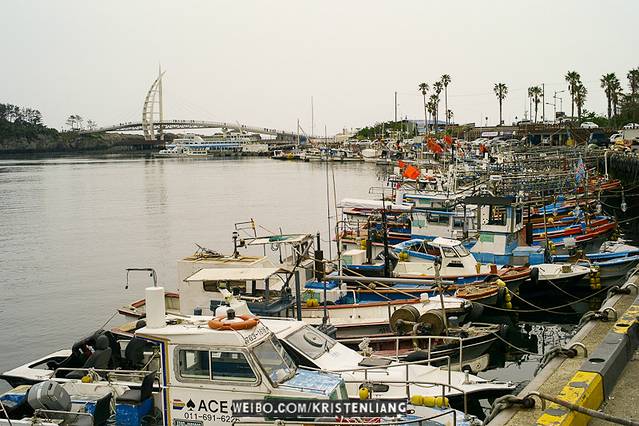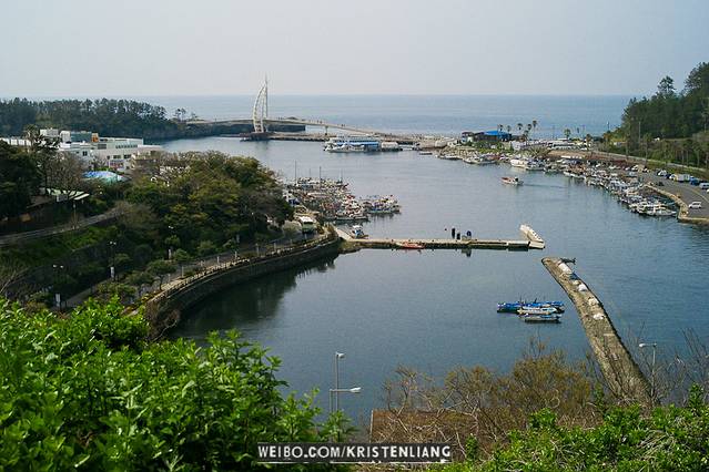 從西歸浦市心走過來,從半山就遠遠看見港口和新緣橋。雖說新緣橋是「源自濟洲島上的傳統木筏“Tewoo”的模樣」,但外型就很像帆船阿!P.S. 新緣橋通向無人島「鳥島」,無料開放,無聊可以去逛逛(順口的!)天地淵瀑就在那裡附近,濟州島最有名的瀑布之一。