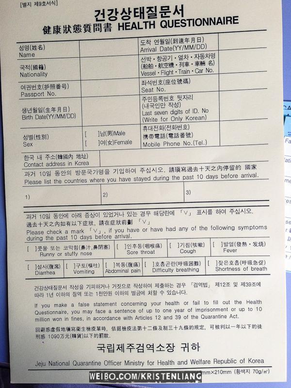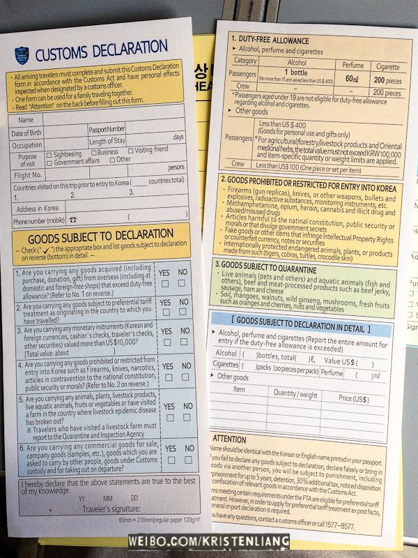 填寫入境紙、健康申報、和海關申報(一個家庭一張),飛機上空姐派的是英日文,不太懂英文的看到日文也知道什麼意思了.... 海關那張實在不行,就在機場拿一份中文的吧。