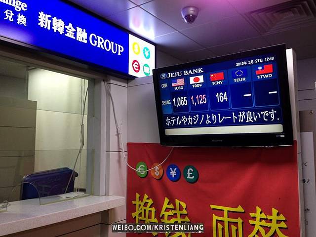 濟州機場有兩家銀行換錢,匯率一樣。樂天酒店(在中文旅遊區裡)的美金/人民幣匯率跟機場一樣,而樂天酒店裡的賭場,人民幣匯率一樣,但美金匯率是我見過最好的。
