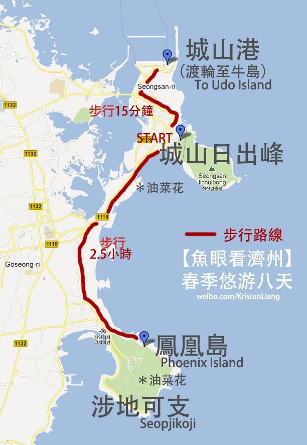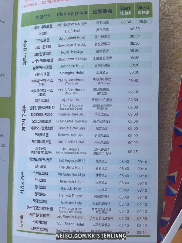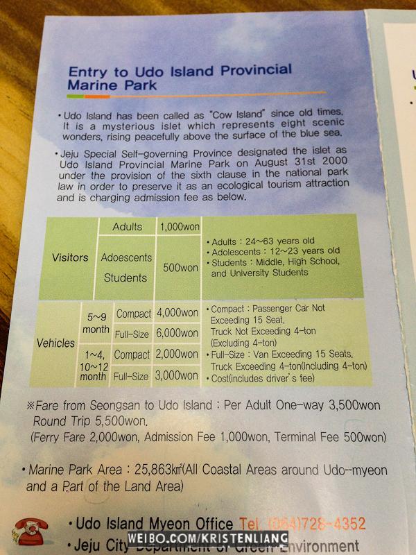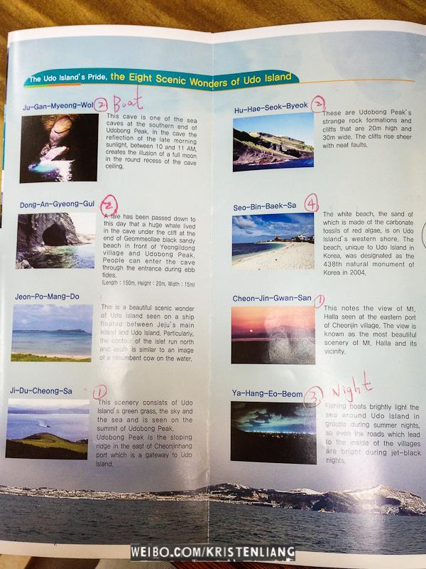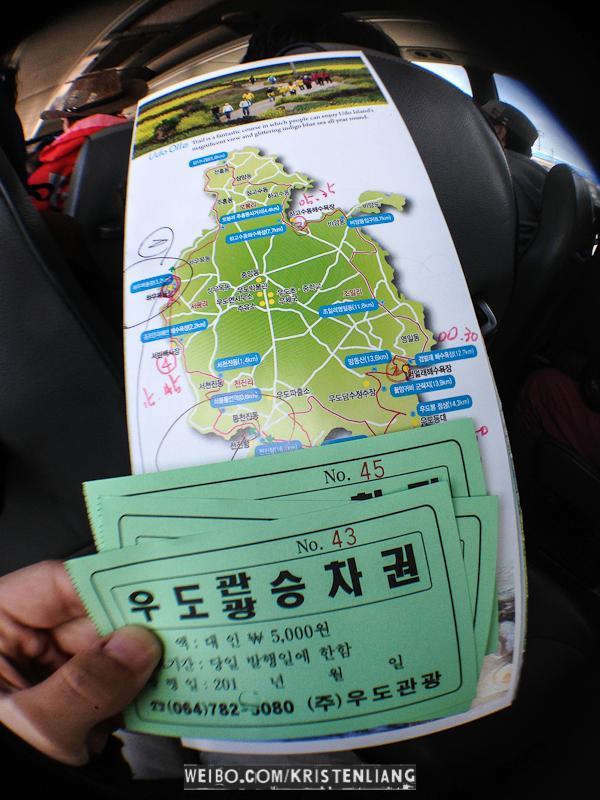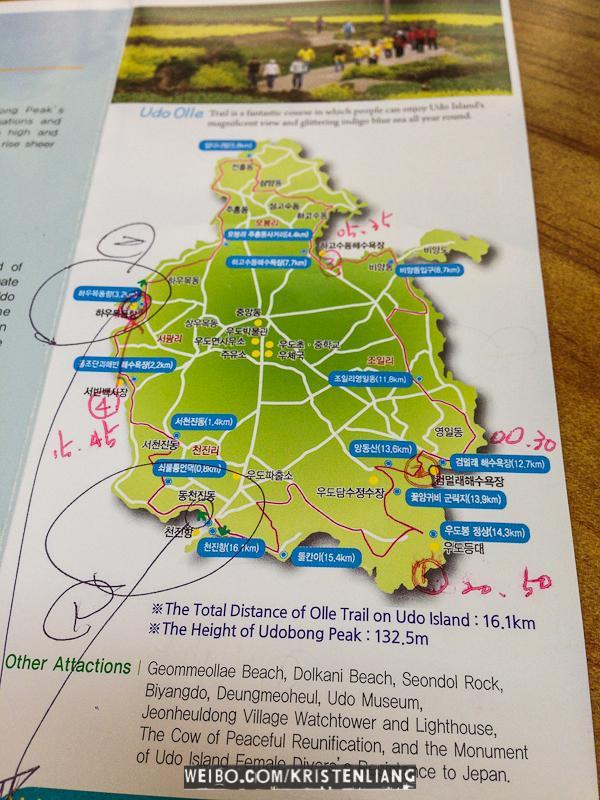 牛島 Udo Island在濟州東部,這個小島只有700多戶居民,有著強烈的鄉村感。盛產海帶、花生、各種海產,關鍵是便宜~ 牛島離城山港只有15分鐘船,如果去城山日出峰後有時間可以走去碼頭坐渡輪,班次好挺頻密的。城山就一個港口,但牛島有兩個港口,兩個港口都可以來回城山。買票之前要先拿張表格名字、年齡、酒店。牛島可以騎單車、騎摩托車、或者5000一人坐巴士環島,下面的地圖是坐巴士去的景點。上面的數字表示那個鐘點在那個景點有巴士,只要憑車票就可以上車~
