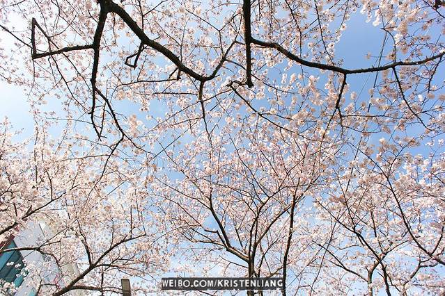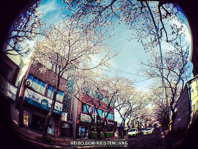 櫻花地點2:濟州大學前一條路,這邊的櫻花拍起來更美,但樹齡沒有典農路老,櫻花沒有那邊的多。