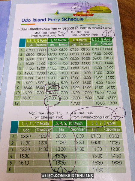 這個表格看得我很混亂,分月份分港口。城山就一個港口,但牛島有兩個港口,兩個港口都可以來回城山。售票員用韓語跟我講了一堆一個字沒聽懂,大概從她畫的圈圈知道是尾班船的意思。我們從城山出發去牛島是12點的船,回程是下午3:30的船。買票之前要先拿張表格名字、年齡、酒店。