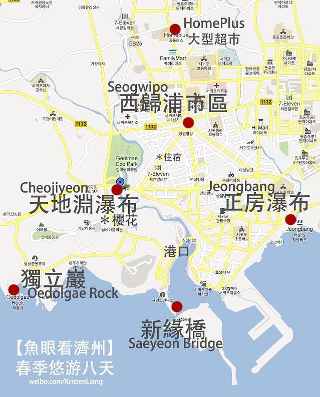 在濟州南部,不太熱鬧的地方。附近有海鮮市場、港口、西歸浦新緣橋、天地淵瀑布、博物館可以去。住了兩晚。