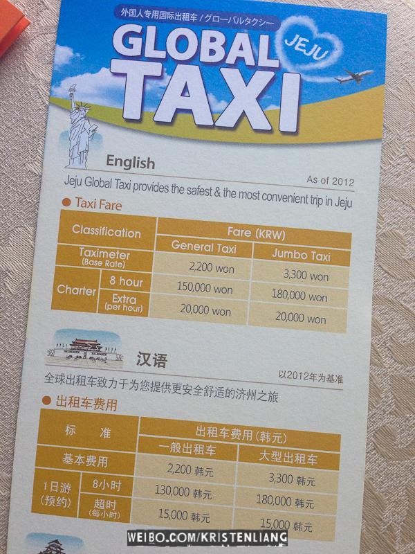 這可以說是自由行最不累、但也可能是最貴的玩法。但有些地方是包車玩比較方便划算,可以直接在路邊招出租車問價錢。我遇到的司機英文都超級爛,幸好司機有地圖,我也有景點的韓文,才不至於雞同鴨講。GLOBAL TAXI包車玩一天(8小時)的收費是130,000won +基本費用2,200won(約人民幣730),司機會中文也充當導遊,必須預約。詳情请看圖。