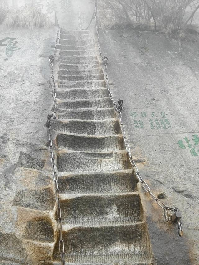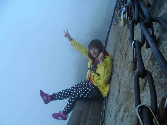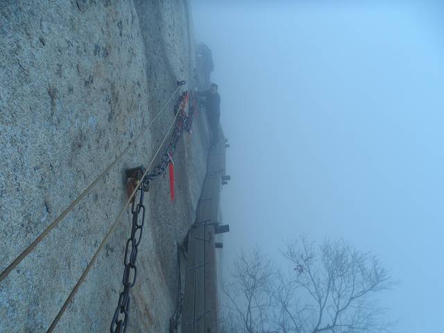 南天门是通往长空栈道的必经之路,去华山之前我最期待的就是去长空栈道走一圈,拍几张刺激的照片回来傲娇一把,可现实和理想的距离注定是会永远存在,罪魁祸首还是雾雾雾雾雾!!!脚底下全是白茫茫的一片,根本察觉不到自己身处悬崖峭壁,面壁贴腹,岌岌可危的恐惧感根本没有。我恨啊!这可恶的天气!