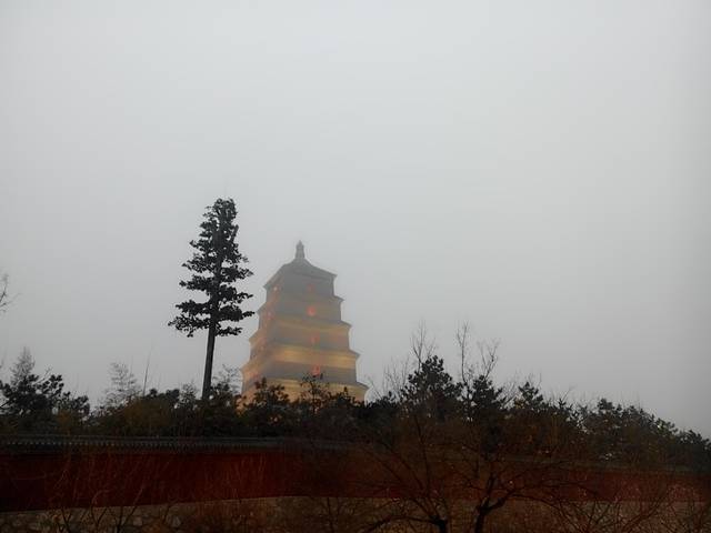 和钟楼一样,我们没有上塔,远远的欣赏它。这一带的雾霾与城墙有得一拼,下午6点钟的大雁塔仿佛被浓烟笼罩,不经意间倒也形成了过度虚化的特效。