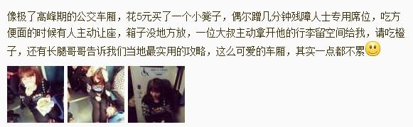 基本设备:外套两件,担心太冷,其中一件是件长款羽绒服;卫衣一件;极具南方特色的秋衣一件;休闲长裤一条;运动鞋一双;帽子一顶;化妆包一袋:护肤品小样三件套,BB霜,粉饼,腮红,润唇膏,口红两支,眼线液,睫毛膏,双色眼印,30L卸妆油;充电器;卷发棒;面膜4张;墨镜;当然,还有坐火车必备宝贝:充电宝!记得出发前一天充足电噢!