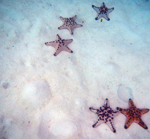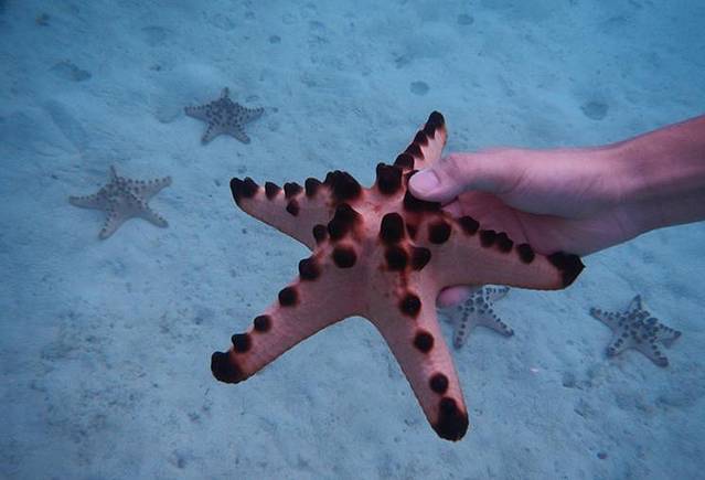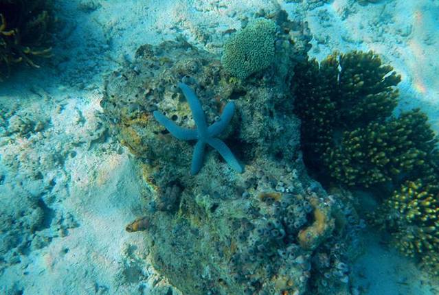 潜着潜着,看到一颗大海星被翻转了,PY突然发挥其比较缺乏的爱心,潜到海底把它放好。当他浮上水面的时候,我就问他:“你不是不能潜到底的吗?刚刚为啥又学会了?”PY愣了一下说:“对喔!”然后愉快地往下潜,但却怎么也到不了海底...